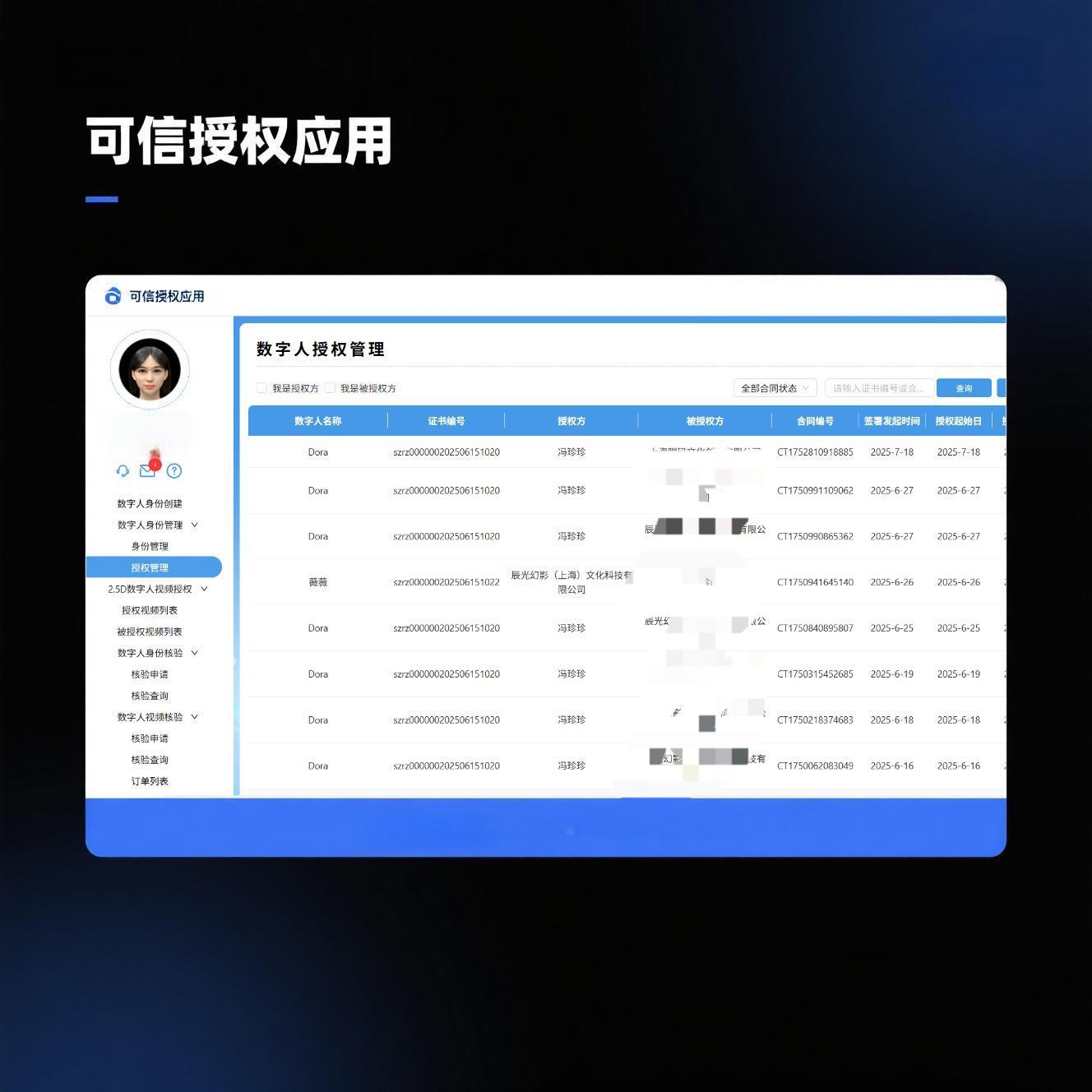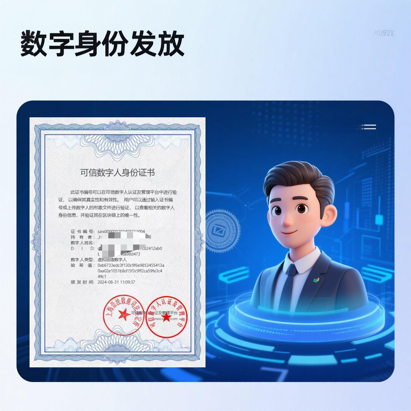 平台基于分布式数字身份(DID)技术构建,由上海数字证书认证中心接口为每个虚拟人发放唯一的“身份证”,司法区块链全程存证支持,提供集数字身份发放、身份核验、存证保护及授权应用等一站式可信数字人应用服务,实现对数字人的权属人、运营方、使用者等各方参与者的权益保护。
